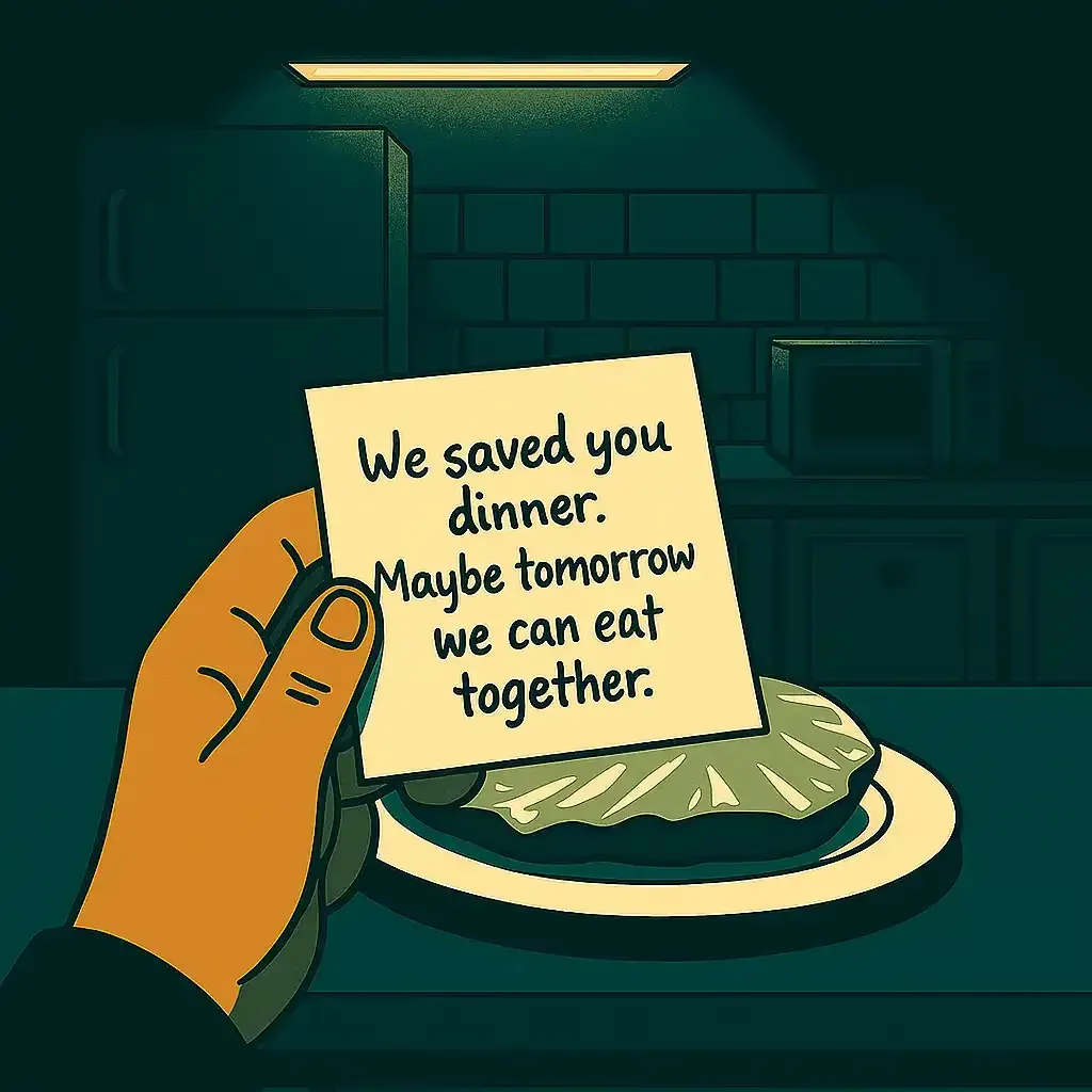 The room felt colder than it should. There was a single plate on the counter, covered with foil.